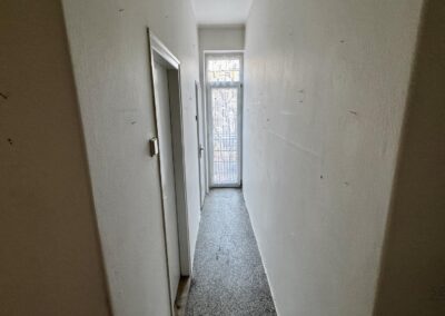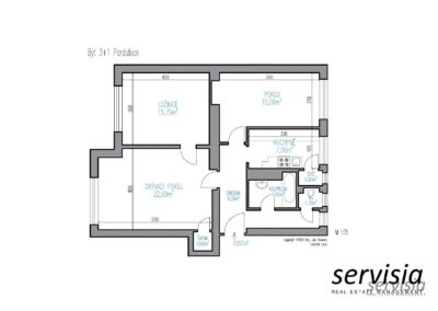 Dispozice bytu je velmi funkční a přehledná. Vstupní chodba zajišťuje samostatné vstupy do koupelny a na WC. Vlevo se pak vstupuje do obývacího pokoje s malou šatnou a dále pak do ložnice. Z chodby je pak po pravé straně vstup do kuchyně, kde je navíc i praktická spíž. Rovně z chodby je pak situován další pokoj. Stěna mezi tímto pokojem a kuchyní není nosná, bylo by tedy možné zvětšit plochu kuchyně.